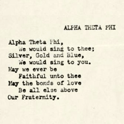 “Alpha Theta Phi, we would sing to thee; Silver, gold and blue, we would sing to you …”