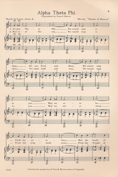 Written in 1912 by Laura Alton, Knox, “Alpha Theta Phi” first appeared in the 1912 edition of “Songs of Delta Delta Delta” and was later used to open Tri Delta’s 1915 Convention. Set to the melody of “Dream of Heaven” in three-quarter waltz time, it’s typically sung as members gather in a circle—hands joined, voices blending, often to open or close a Tri Delta event.