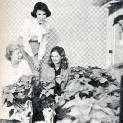 Bryan-College Station, Texas, alumnae carrying in pots of poinsettias for guests to select at the Poinsettia Pickup Coffee in the home of Keith German Halsell, center, are Netti Woodson Yager, left, and Jan Givens Denton, right, all Texas.