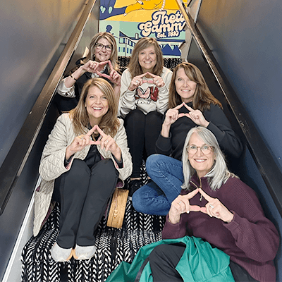 Delta Eta class of 1990 alumnae returned to Coe College for Homecoming 2025 with a purpose—to support their chapter. Their commitment to supporting the Delta Eta Chapter and strengthening the collegiate experience lives on years beyond their own graduation. Five current members joined the alumnae for the photo, standing behind their 1990 sisters. Delta Eta alumna Betsy Fischer Rice ’75, who just wrapped up 10 years as president of the Rochester Alumnae Chapter, was also honored. To celebrate Betsy’s service, members of her alumnae chapter made a gift in her honor to her collegiate chapter.