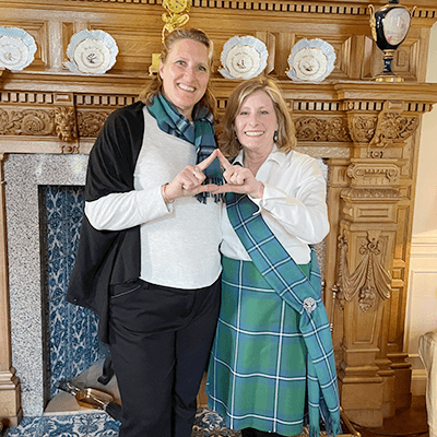 While touring Scotland with the Clan Irwin Association, Peggy Young Rishe, Illinois, spied a member of the group carrying a pansy purse. Peggy asked, “Are you Tri Delta or Theta?” Tiffiny Ferrell, Drury, replied, “Tri Delta.” Both women recently stepped down from serving as alumnae chapter presidents and discovered that they share many loves, including Tri Delta!