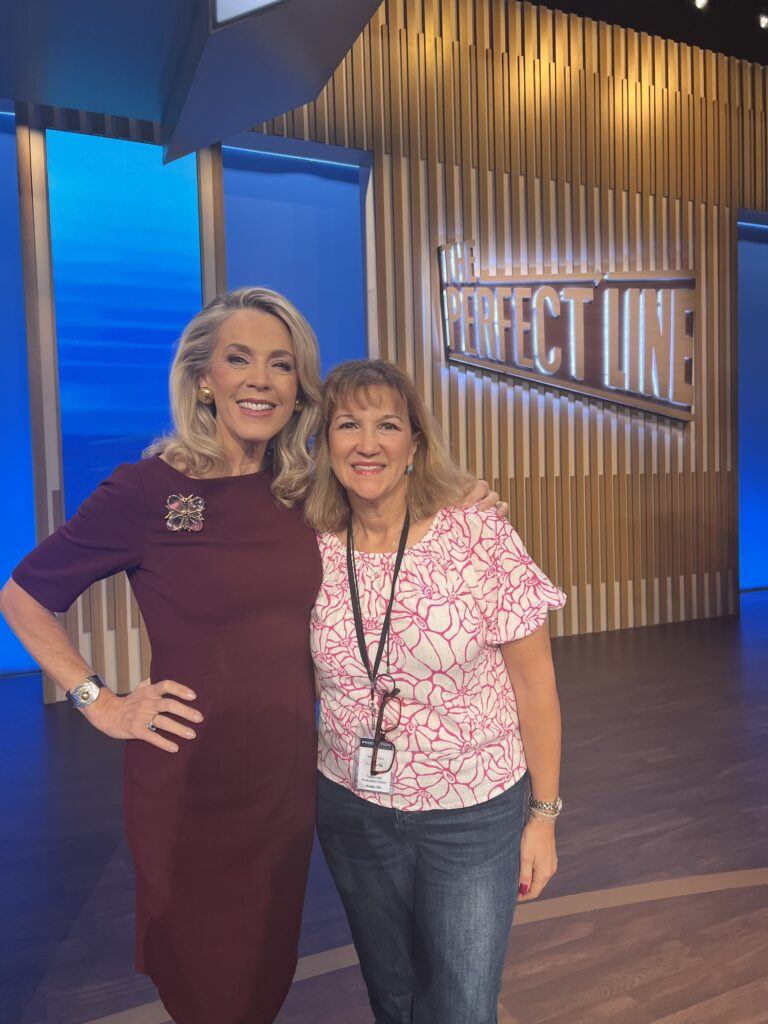 This summer, a new game show titled “The Perfect Line” was filmed in Fayetteville, Georgia (just south of Atlanta), where two Tri Delta alumnae met. Shooting the show’s entire season over two months brought together two television veterans, relocating from their homes for the summer. The show’s host, Deborah Norville Wellner, Georgia, a renowned television journalist and personality from the East Coast, found herself collaborating with Risa Fishbein Thomas, Cal State /Northridge, a script supervisor and associate director from the West Coast.